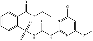 化學(xué)名稱:2-(4-氯-6-甲氧基嘧啶-2-基氨基甲酰氨基磺酰基)苯甲酸乙酯; 氯嘧黃隆; 3-(4-氯-6-甲氧基嘧啶-2-基)-1-(2-乙氧基甲?;交?磺酰脲